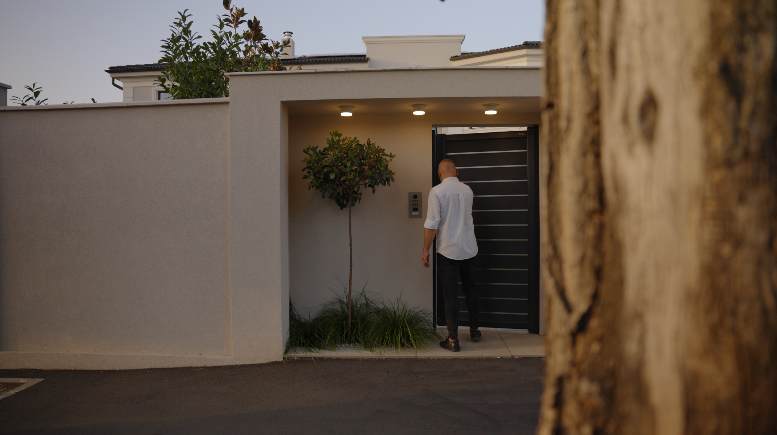În ceea ce privește siguranța și accesul, senzorii de inundație trimit alertă instant și comandă oprirea alimentării cu apă a clădirii. Accesul este ușor și sigur: amprentă eKey pentru ușa principală, interfon DoorBird la poartă, monitorizare poziție pentru poarta auto și ușile de garaj prin contactele magnetice, toate vizibile în aplicație. Scenariile „Home/Away” ajustează luminile, climatul și umbrirea dintr-o singură atingere.