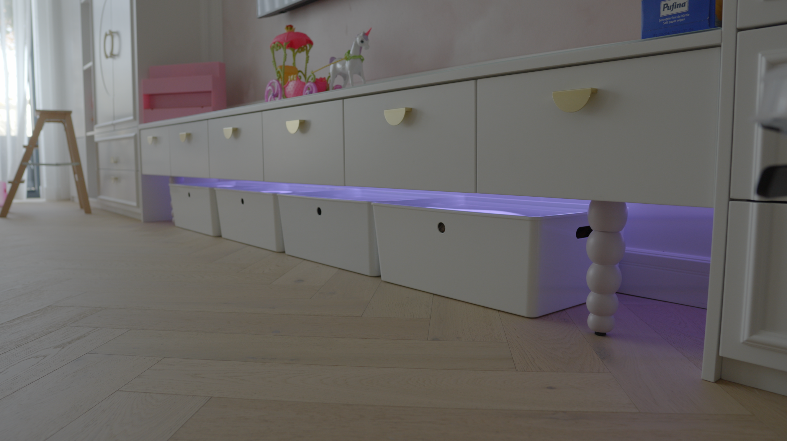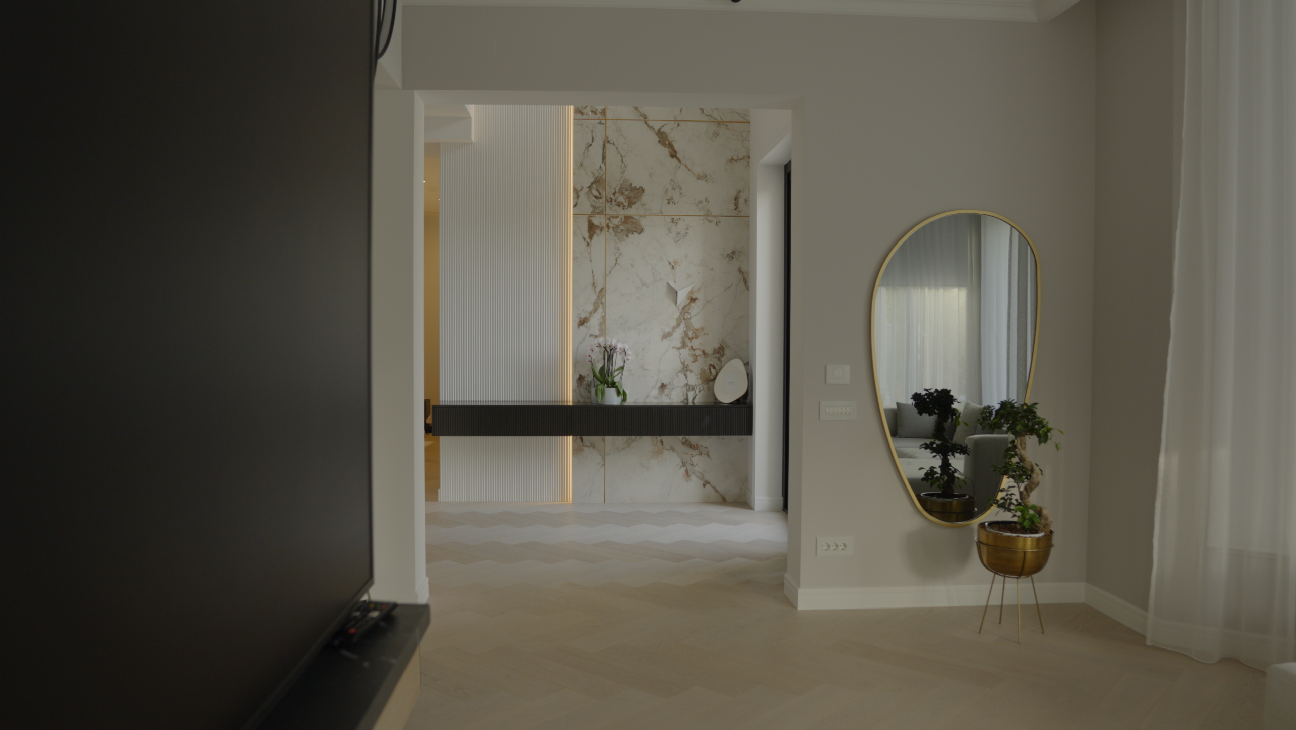 Iluminatul combină circuite on/off, dimabile și RGBW, precum și scenarii personalizate după nevoia clientului, cu senzori de mișcare în holuri sau la trepte pentru eficiență și siguranță pe timp de noapte.