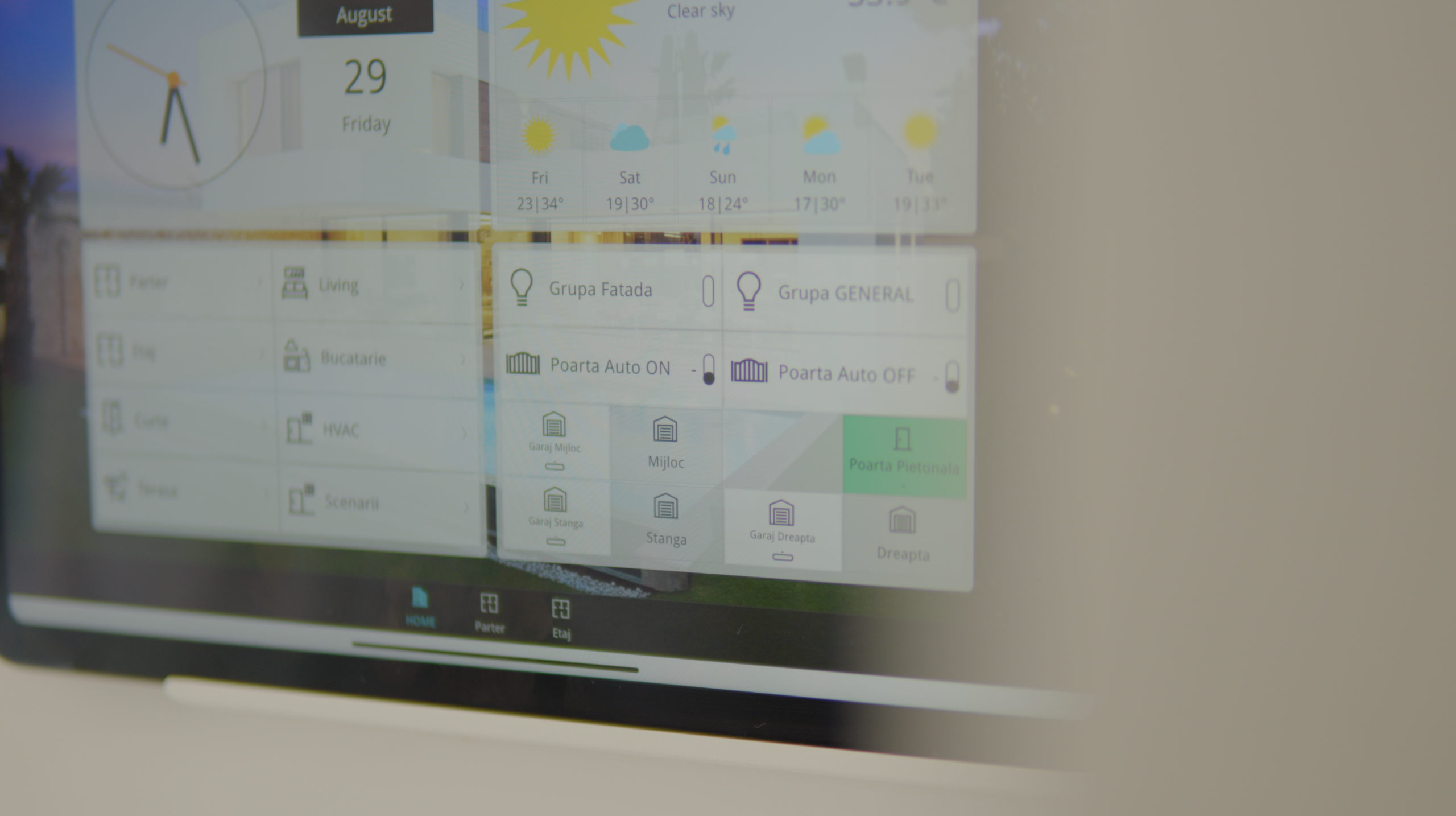 Vizualizarea de la ComfortClick este personalizată pe camere (fundaluri dedicate, pictograme clare), iar iPad-ul montat pe perete (suport Dame Wall Home - Displine) devine „centrul de comandă” al casei. Pe telefon, utilizatorii au shortcut-uri rapide („Acces curte”, „Totul oprit”, „Noapte”), păstrând aceeași logică vizuală.