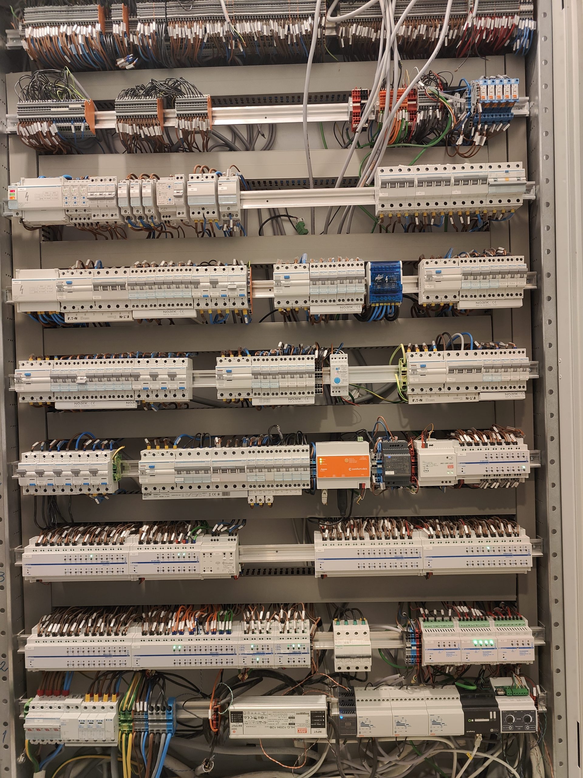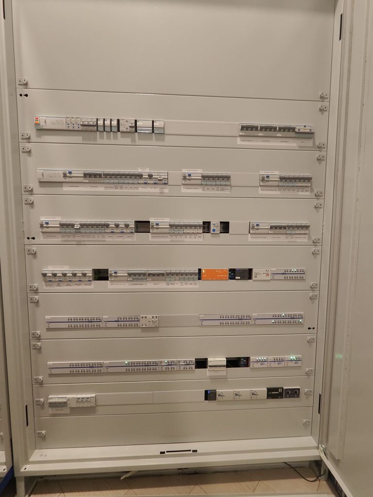 • Dispozitive KNX (94): 6 actuatoare universale iluminat, 4 actuatoare dimare iluminat, 1 actuator jaluzele, 2 actuatoare încălzire, 1 actuator răcire, 10 termostate, 47 întrerupătoare, 22 senzori prezență/temperatură/umiditate, 1 gateway KNX-IP.